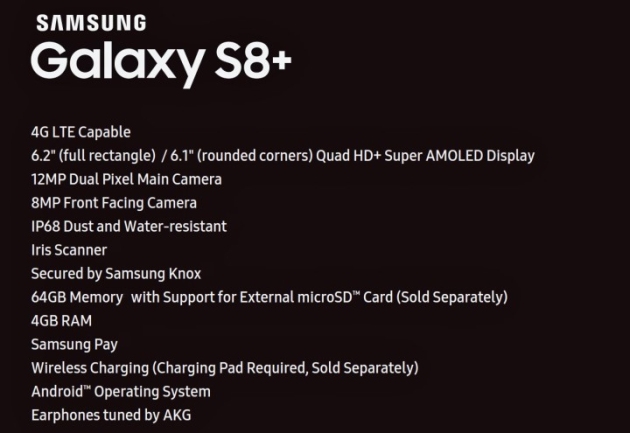 fot. SammobileGalaxy S8+ będzie wyposażony w ekran Super AMOLED o przekątnej 6,2 cala i rozdzielczości Quad HD, 4 GB RAM, a także rozszerzalną pamięć o wielkości 64 GB. Z dodatkowych funkcji warto wymienić skaner tęczówki, bezprzewodowe ładowanie oraz odporność na kurz i wodę (IP68). Nie znamy jednak procesora, jaki znajdzie się w urządzeniu, jednak najbardziej prawdopodobnymi kandydatami są Snapdragon 835 oraz Exynos 9.